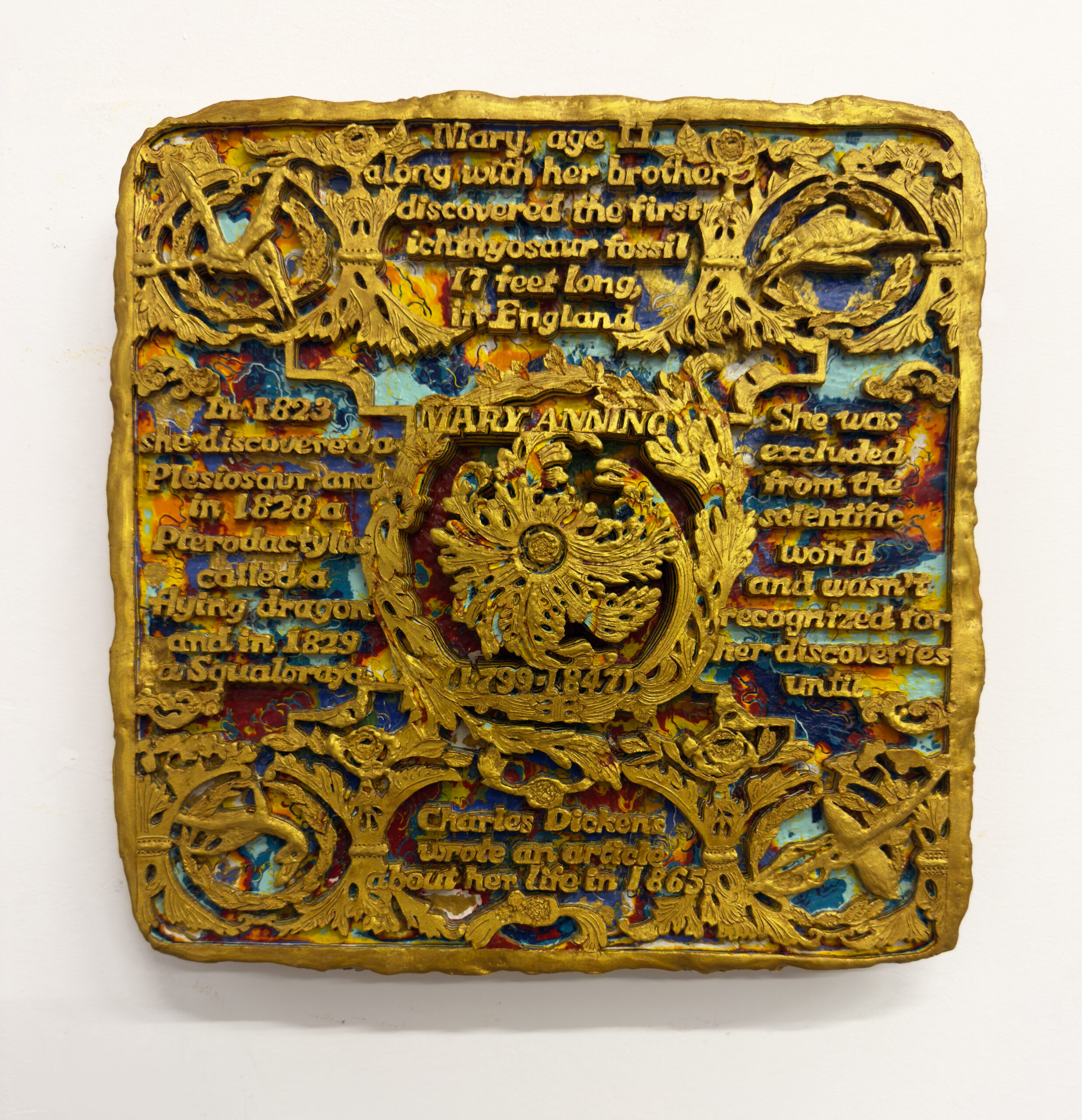 Mary Anning, 2025, 12" x 12", carved encaustic on panel
