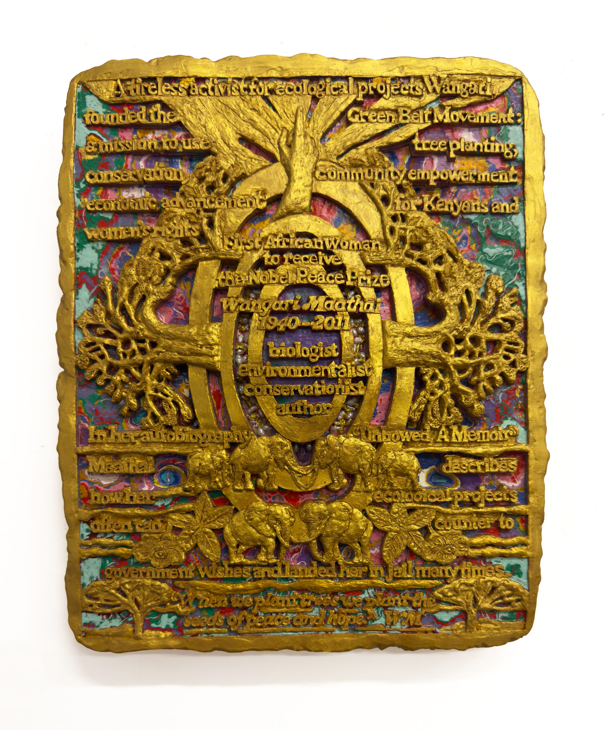 Wangari Maathai, 2025, 12" x 9", carved encaustic on panel