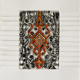 Woven Untitled with Orange and Gold, 2013; woven intaglio with hand coloring