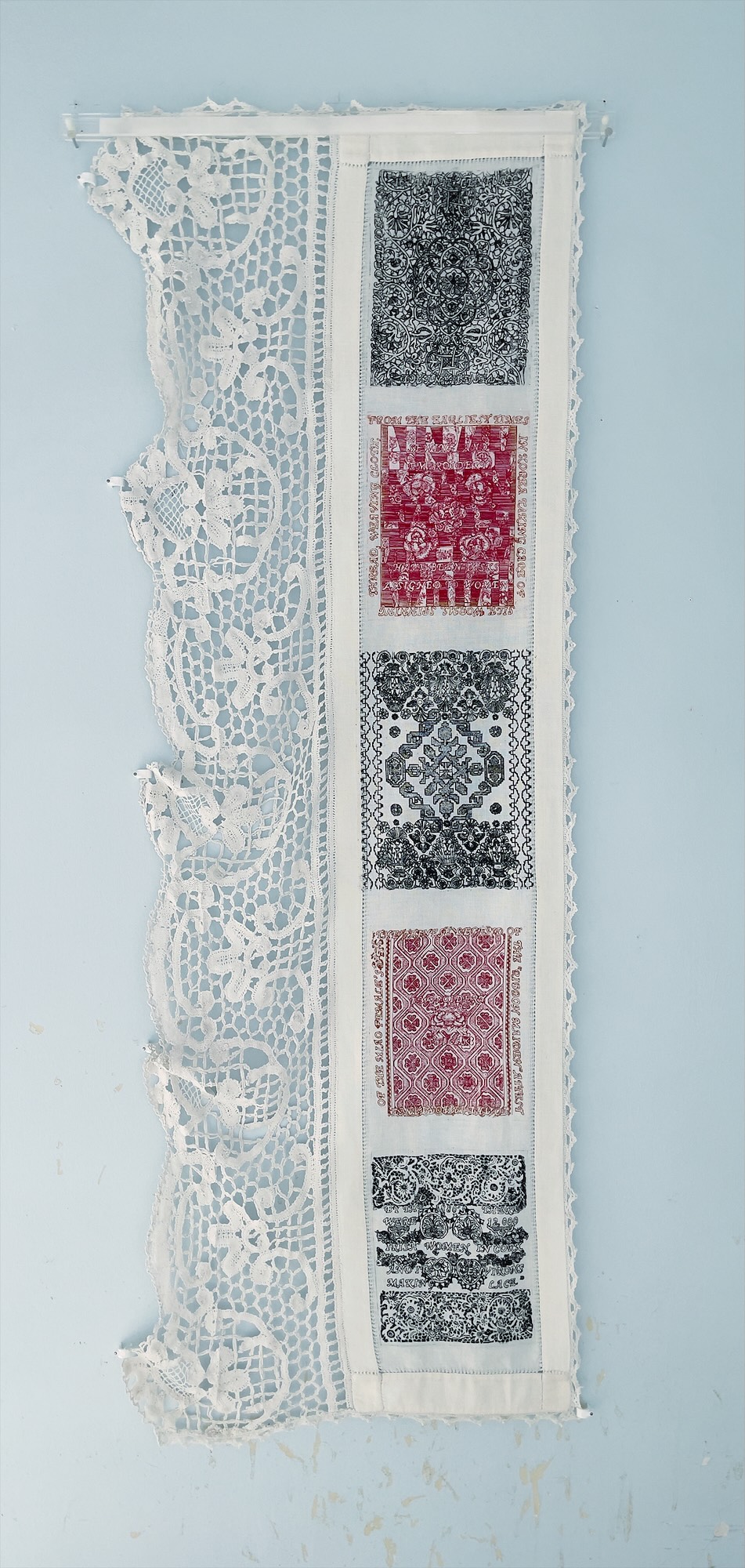 Connections, 2021, five etchings printed on vintage Italian textile, 66" x 28"