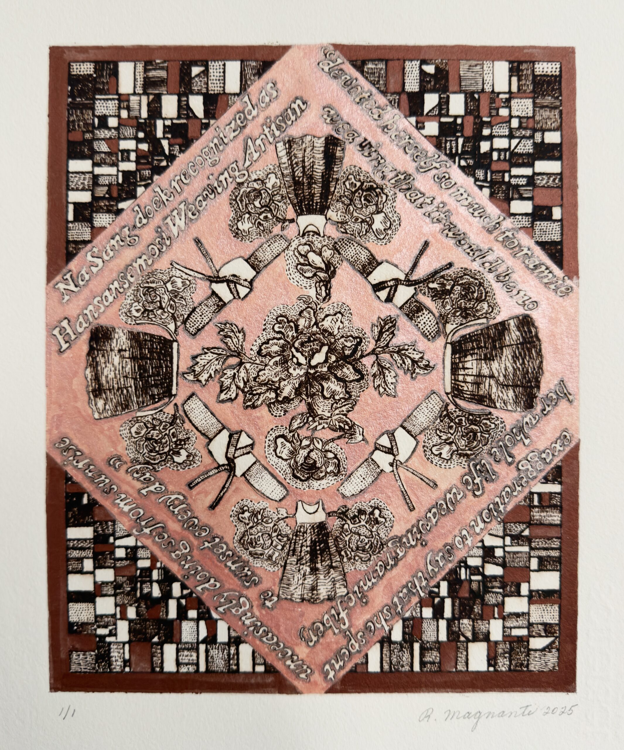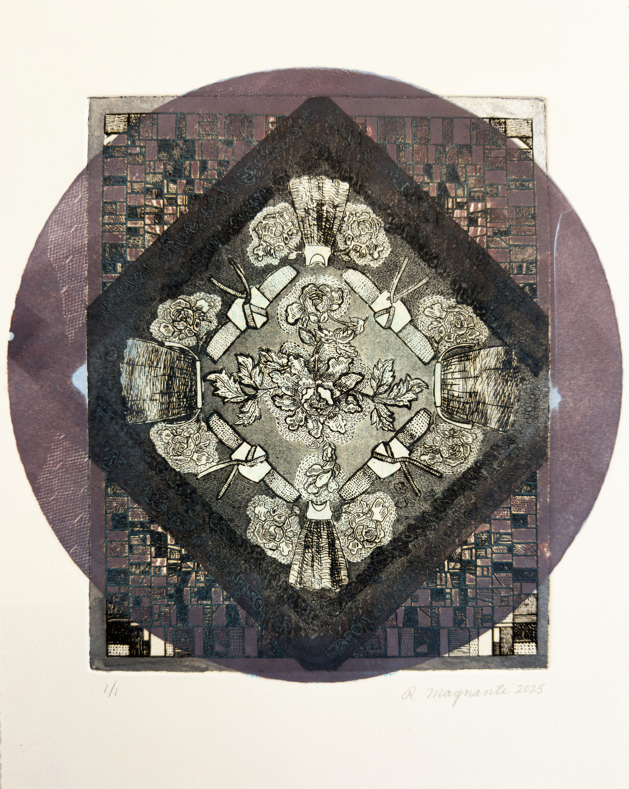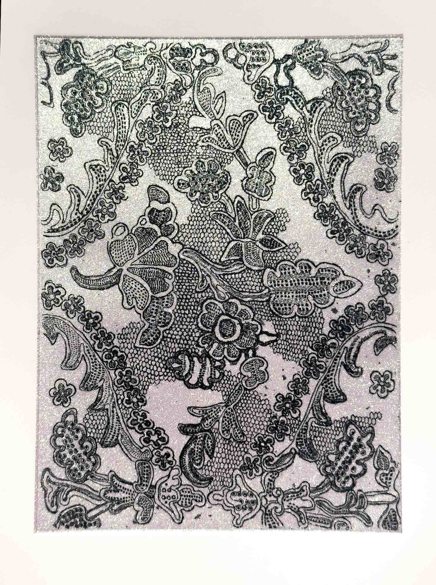 Italian Lace Pattern, 2023, etching mono print with mica, 10" x 8"