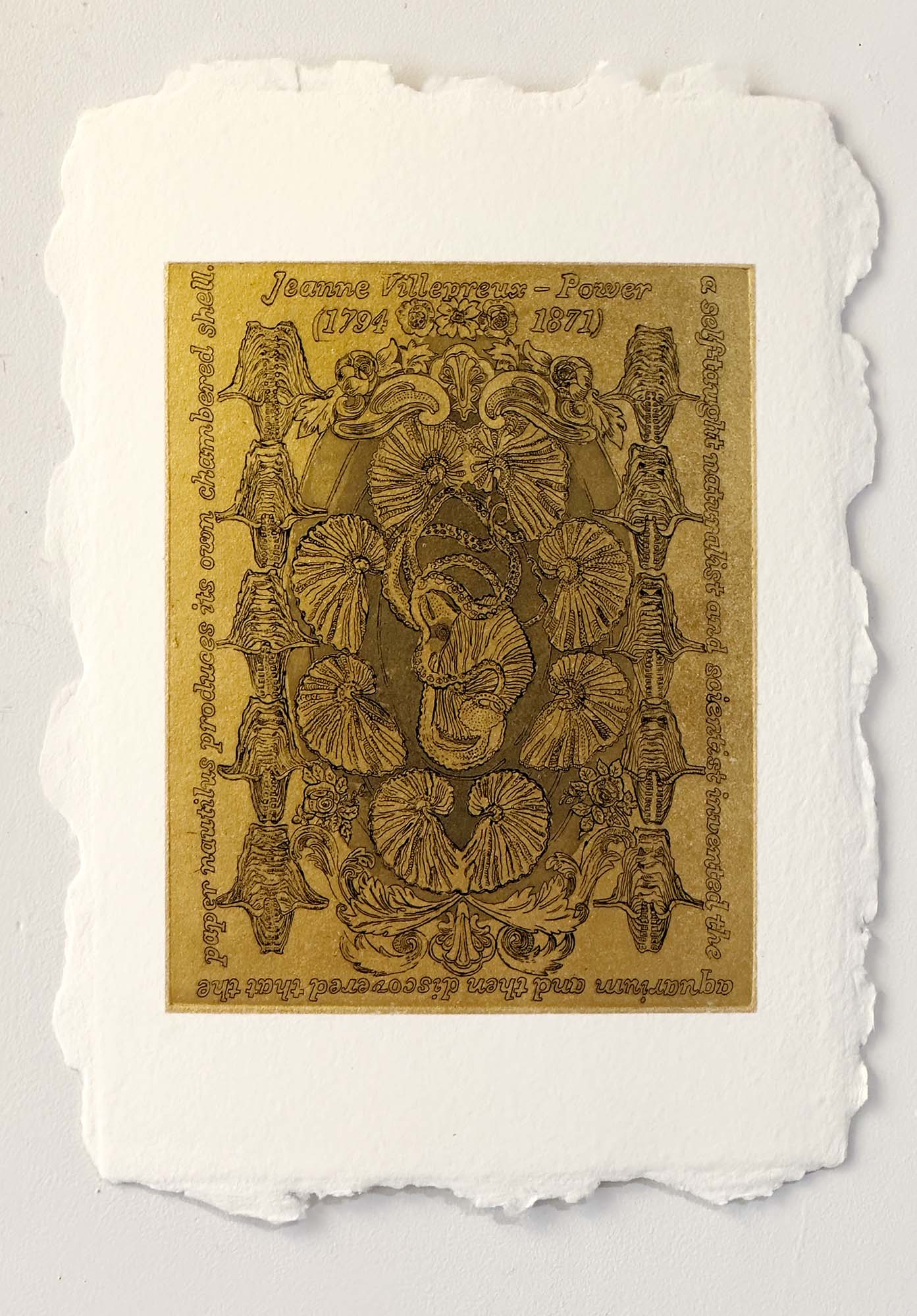 Jeanne Villepreux-Power, 2024, etching monoprint with gold leaf on handmade paper, 10" x 8"