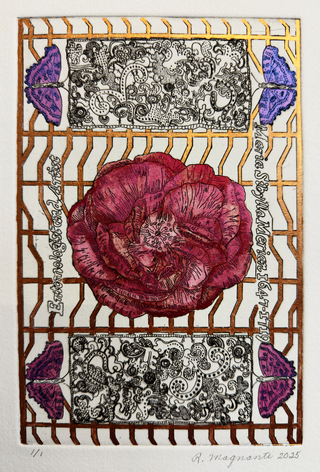 Maria Sibylla Merian, 2025, etching with hand coloring, 10" x 8"