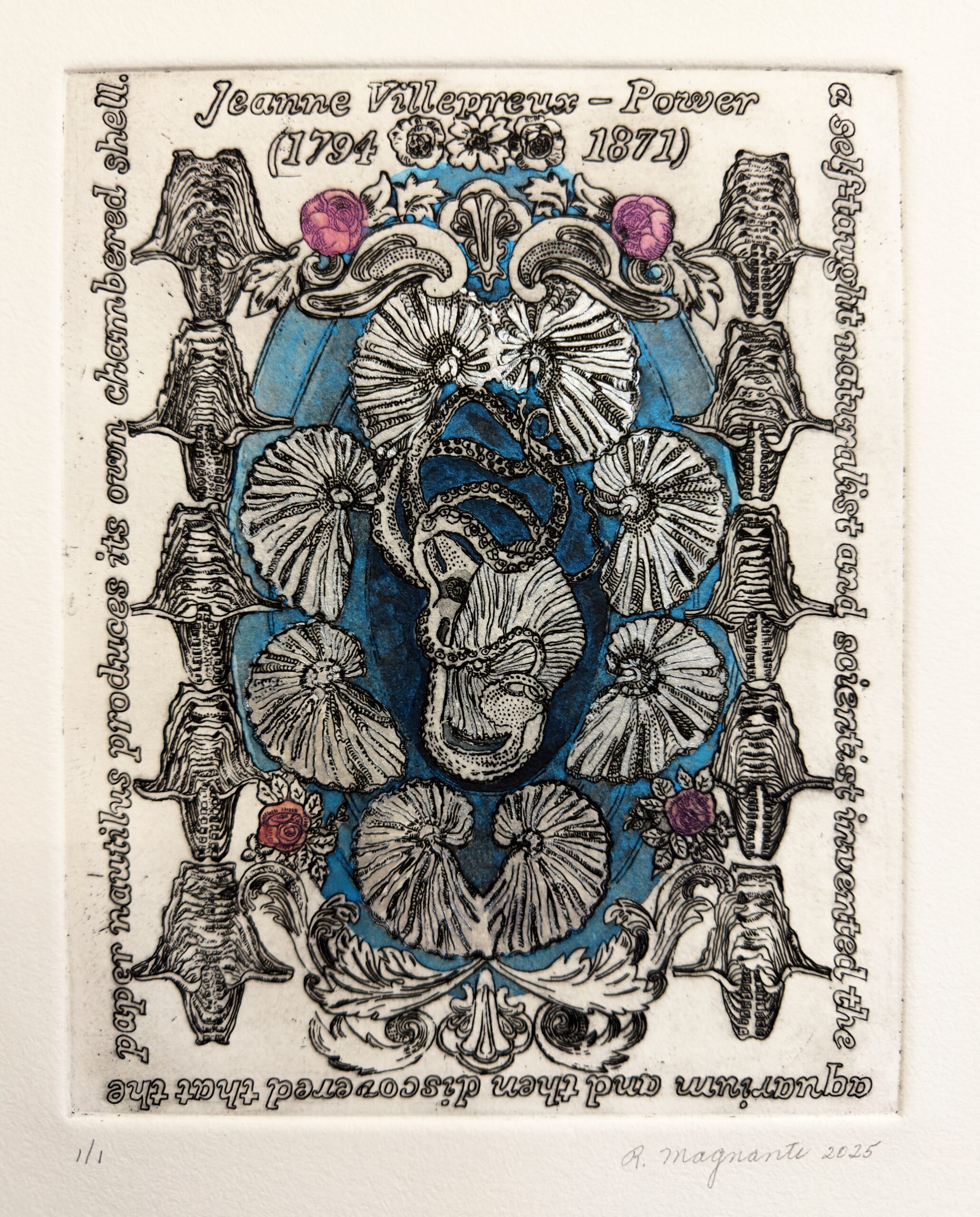 Jeanne Villepreux-Power, 2025, etching with watercolor, 10" x 8"